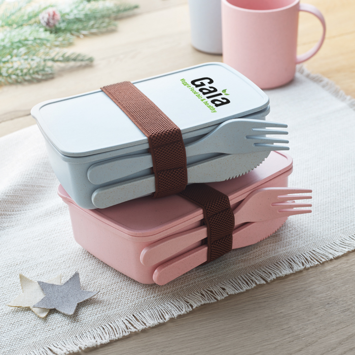 Boîte à lunch avec 1 compartiment, 1 fourchette et 1 couteau en 50% fibre de bambou et 50% PP.