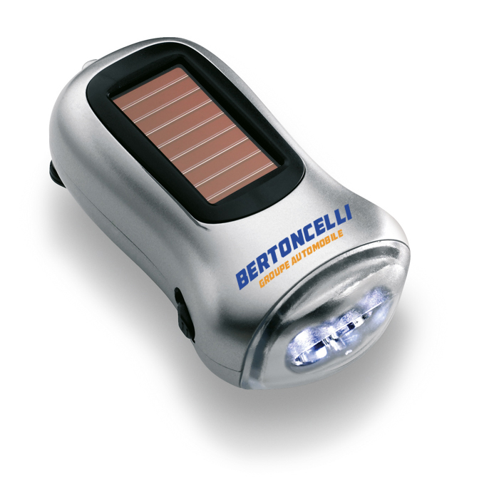 Torche à double alimentation : solaire et à dynamo. Corps ABS satiné argenté.